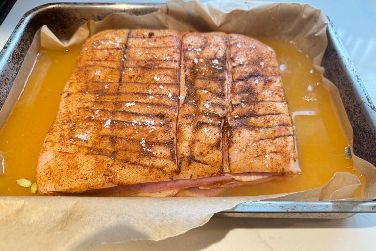 6. Place the pork on the bottom of a roasting tin and carefully pour the apple and orange juice mix around the pork so that it comes up to about half way to the top of the meat. It is really important not to pour the juice over the pork, the top has to stay dry if it is to crackle.